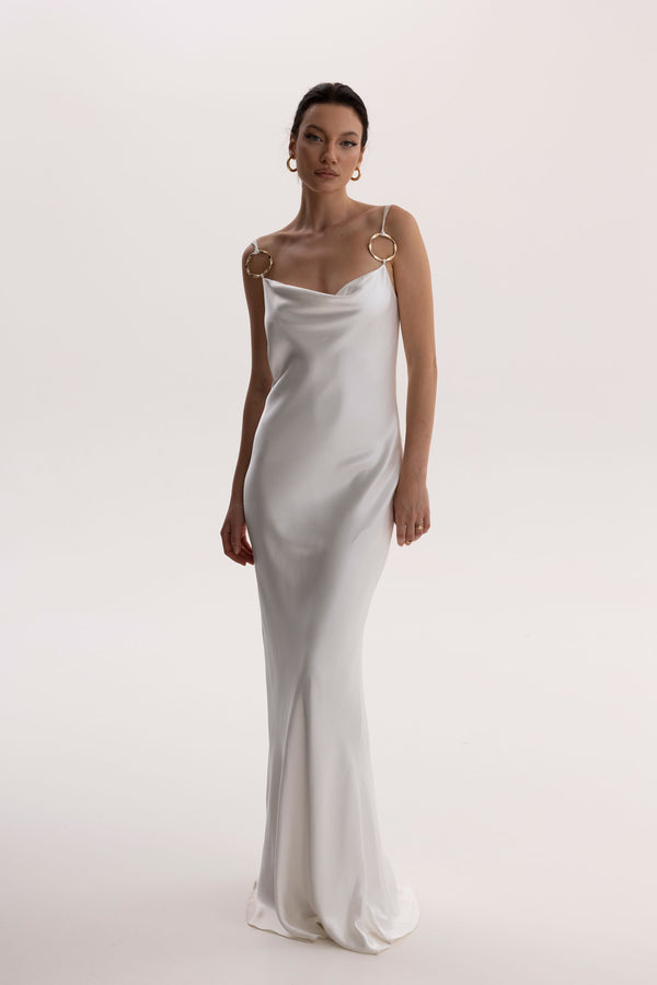 A silhouette that flows like moonlight over water — Amor Puro is a floor-length slip gown that glides with quiet power. Cut from liquid satin in a luminous ivory, it skims the figure with an effortless drape, the cowl neckline softening into fluid lines. Twin gold rings at the shoulders lend a sculptural edge, transforming simplicity into statement. This is the dress that doesn’t whisper — it lingers.