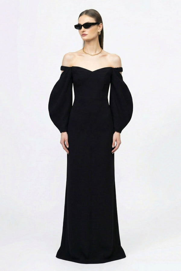 Black Tulip Long is sculpted in a structured off-shoulder corset bodice that defines the torso with precision, extending into a floor-length column silhouette interrupted by a sharp front slit. The neckline curves clean and controlled, while the rounded, architectural sleeves bloom at the arms like petals after dark.