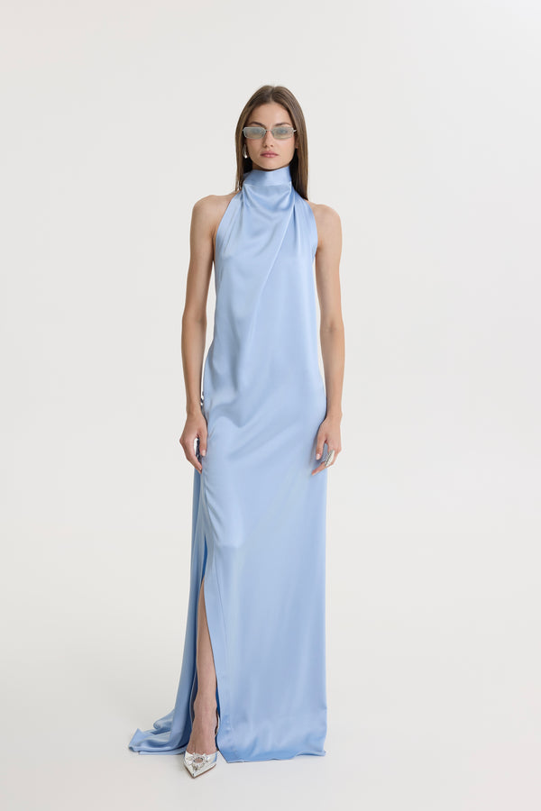 A study in modern elegance, Blue Allure is crafted from lustrous satin in a vivid blue that captivates at every angle. The draped high neckline softly frames the shoulders, while the figure-skimming silhouette flows effortlessly into a floor-length hem. A delicate row of fabric-covered buttons trails down the side, finished with a subtle slit for graceful movement.
