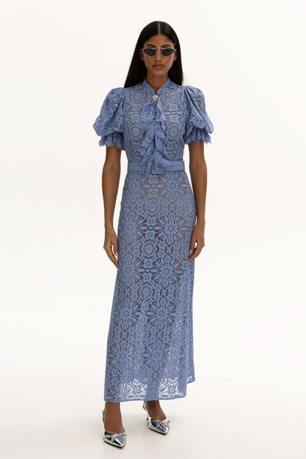 A silhouette that feels like sky spun into lace — Celeste Dress is a floor-length vision cut entirely from intricate embroidered lace, left unlined so that skin becomes part of the design. Puff sleeves and cascading ruffles frame the bodice with romantic drama, while the tailored belt cinches the waist into soft definition. Airy, sculptural, and unapologetically ethereal, this is the dress that doesn’t conceal — it reveals.