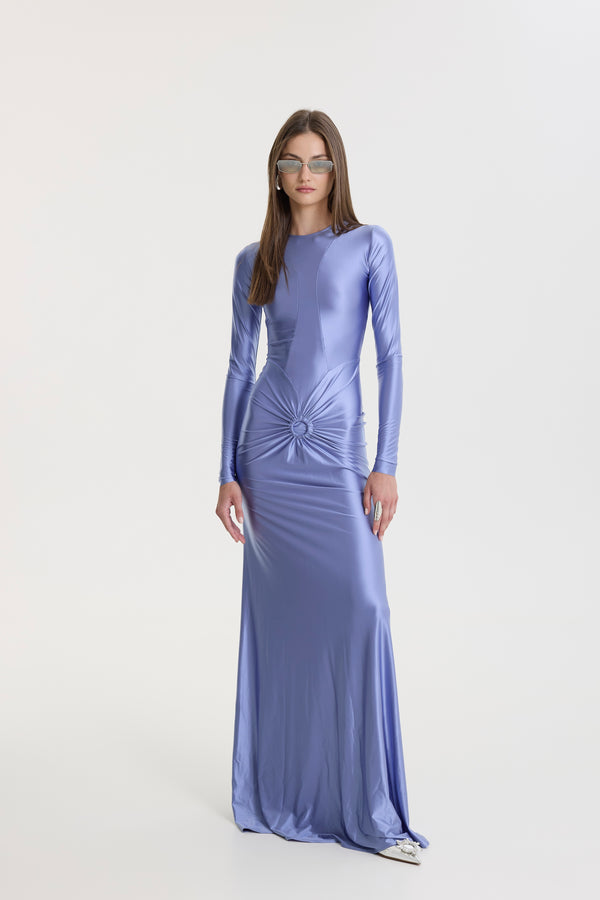 Sleek, sculptural, and unapologetically modern — Electric Bloom is a floor-length gown crafted from high-shine stretch satin in an electric lilac tone. The design features a fitted long-sleeve silhouette and a gathered rosette detail at the hip that blooms from the center, drawing the eye and accentuating the waist. With its clean lines and liquid-like finish, it brings futuristic elegance to eveningwear.