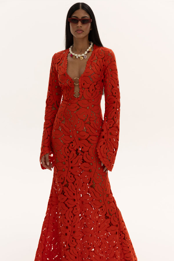 A silhouette that burns like a secret flame —Flame Bloom is a floor-length gown carved from bold cut-out lace, its fiery hue commanding every glance. The plunging neckline is bound by gold rings, drawing the eye to its sculptural lines, while long flared sleeves ripple with movement. Tailored to trace the body before flaring into a mermaid hem, it is both daring and divine. This is the dress that doesn’t blend in — it blazes.