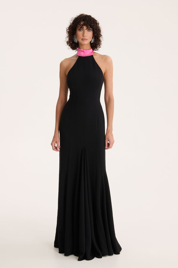 Minimal in the front, unforgettable from the back — Glinda Noir Gown is a study in contrasts. The sleek black column shapes the body with calm precision, while the bright pink satin bow drapes dramatically down the spine, bringing a soft, feminine glow to an otherwise sharp silhouette. It’s modern, sculptural, and unexpectedly romantic.