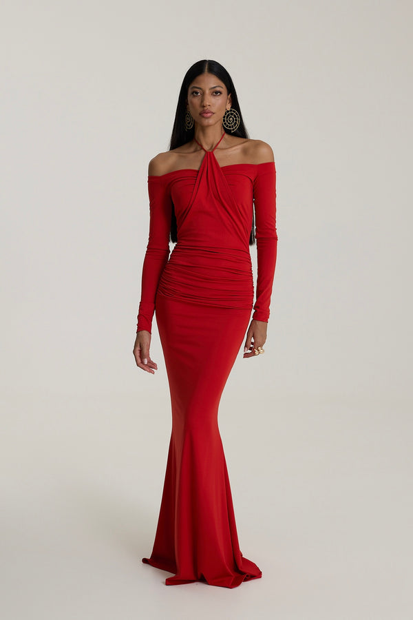 A bold silhouette with sculptural softness — Heatline Dress is made to mesmerize. Designed in a vivid red stretch fabric, this gown features an off-the-shoulder neckline paired with a halter twist that draws the eye to the collarbones. The bodice is expertly ruched across the waist and hips, creating a contoured, feminine shape that falls into a floor-length skirt with effortless flow.