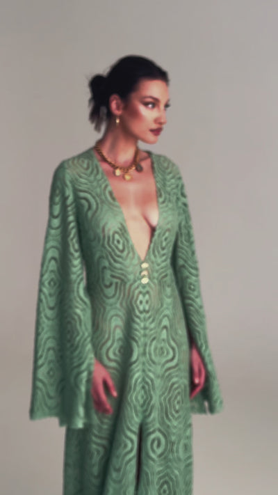 A whisper of craft turned into allure — Lace Temptation is a gown that fuses romance with bold seduction. Its deep plunging neckline dares with confidence, while wide, flared sleeves soften the silhouette in graceful balance. Cut from intricate green lace traced with geometric patterns, it flows to the floor in sculptural precision, every fold alive with texture and light. Both daring and delicate, this is temptation woven into elegance.