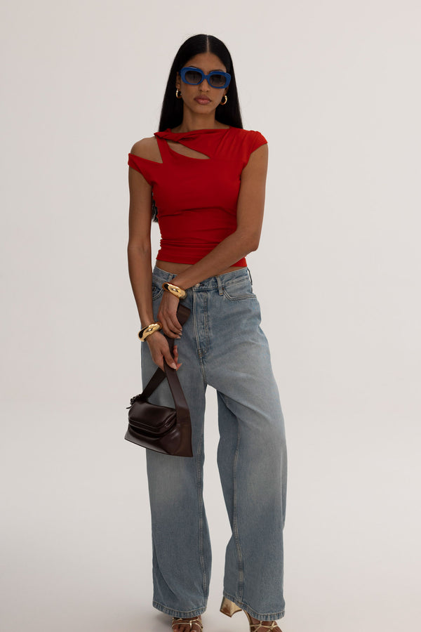 Bold, asymmetrical, and unapologetically cool — this sculpted red top is your wardrobe’s new hero. Featuring an off-kilter neckline with twisted and cut-out detailing, it brings a fresh edge to minimal styling. The form-fitting silhouette hugs the body just right, blending softness with structure for that model-off-duty energy.
