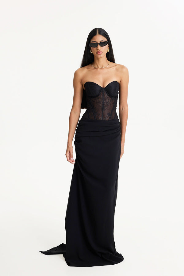 Fierce and refined in equal measure, Lunar Lace is a gown that balances structure with seduction. The sheer lace corset bodice, complete with boning and underwire cups, sculpts and lifts while revealing just enough. A fluid black skirt cascades from the waist, gathered with subtle draping, creating a floor-sweeping silhouette that moves with dark elegance.