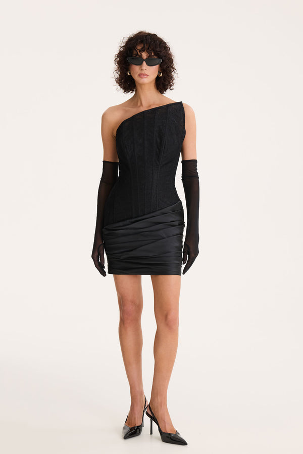 A modern whisper of noir elegance, Nightfall Muse blends sculpted structure with a sleek, city-ready edge. The asymmetric lace bodice contours the silhouette with subtle detailing, while the ruched satin skirt wraps the hips in soft, architectural folds. Minimalist yet magnetic, it moves with a quiet confidence—short, sharp, and impossibly chic.