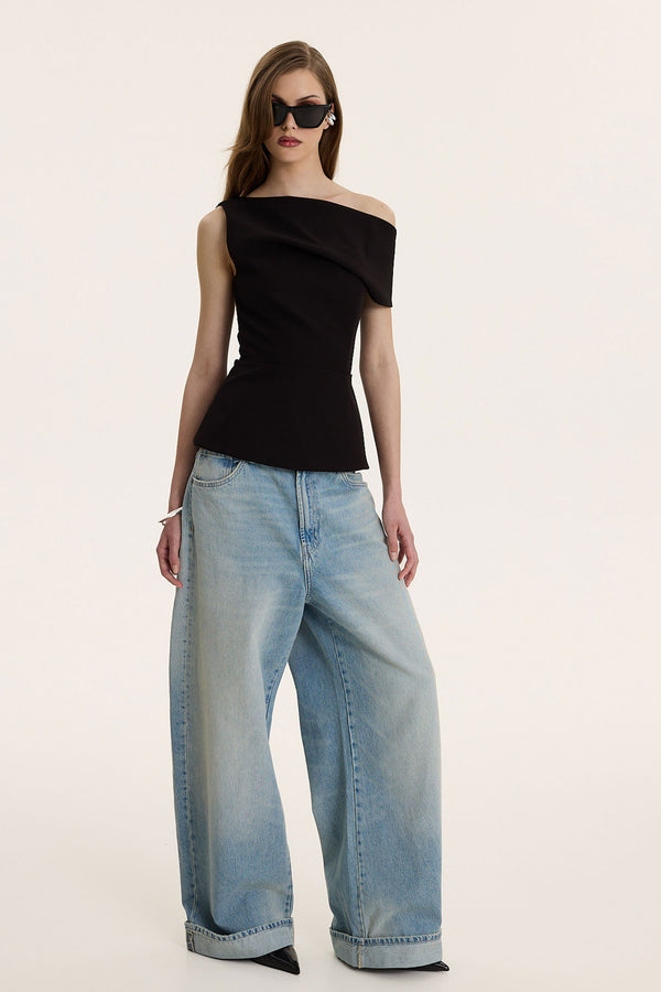 Noir Edit is cut in a sculpted one-shoulder silhouette that frames the collarbone with precision. The structured bodice contours the waist before flaring into a subtle peplum, creating a sharp, defined shape.