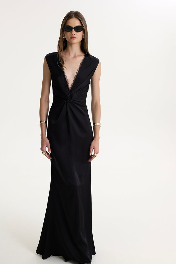Refined seduction, sculpted in shadow — Noir Elegance is a floor-length black gown cut to contour with quiet command. The plunge neckline is edged in delicate lace, drawing the eye with a whisper rather than a shout. A central knot gathers the silk-blend fabric at the waist, creating soft draping that flatters and flows into a statuesque column. With clean shoulders and no sleeves, the silhouette is stark yet fluid — modern, minimalist, magnetic.