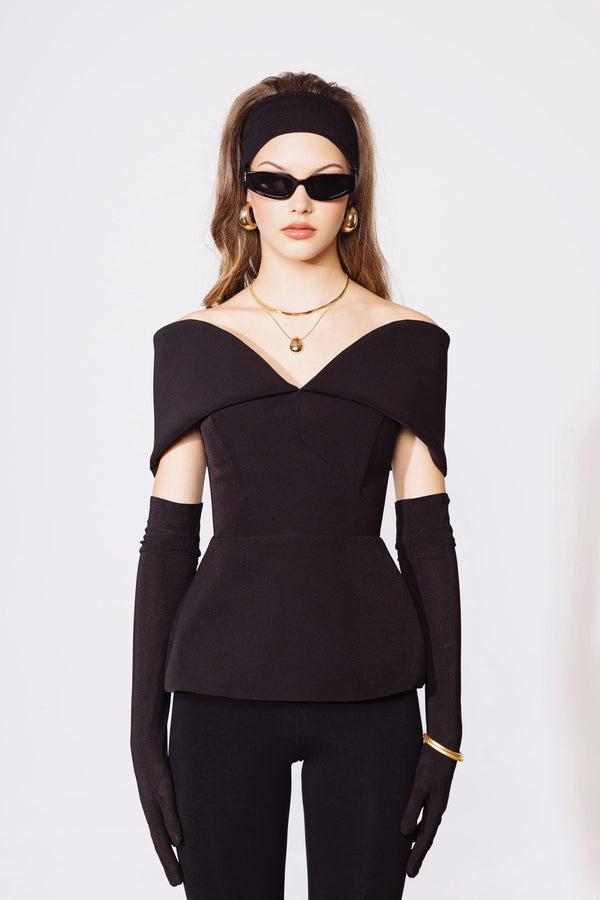 A shadow shaped into elegance — Noir Heart Top is a top that turns minimalism into sculpture. Cut in deep black, its off-shoulder neckline folds like midnight in bloom, framing the shoulders with quiet drama. The fitted bodice extends into a subtle peplum flare, balancing sharp structure with fluid femininity. Timeless yet bold, it is a piece that speaks in silhouettes.