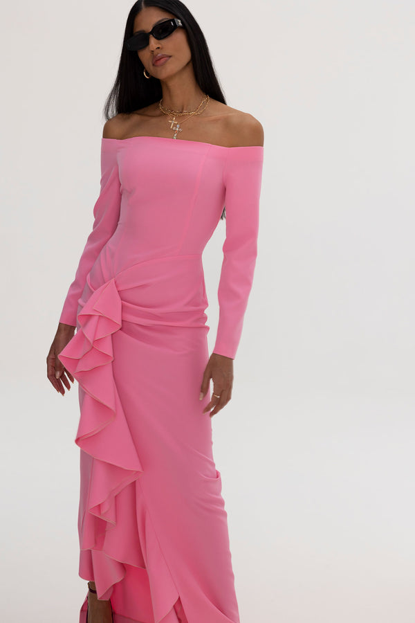 Embrace the power of pink in this ultra-feminine off-the-shoulder gown, where elegance meets playful charm. The sculpted silhouette hugs the body with grace, while the cascading ruffle detail adds soft movement and texture to every step. With its long sleeves and beautifully draped fit, this piece is designed to celebrate confidence with a romantic twist.