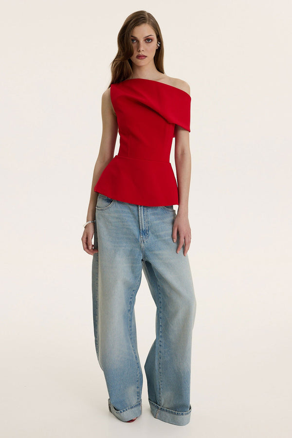 Red Edit is cut in a sculpted one-shoulder silhouette that frames the collarbone with precision. The structured bodice defines the waist before flaring into a clean peplum, creating a strong, unmistakable shape.