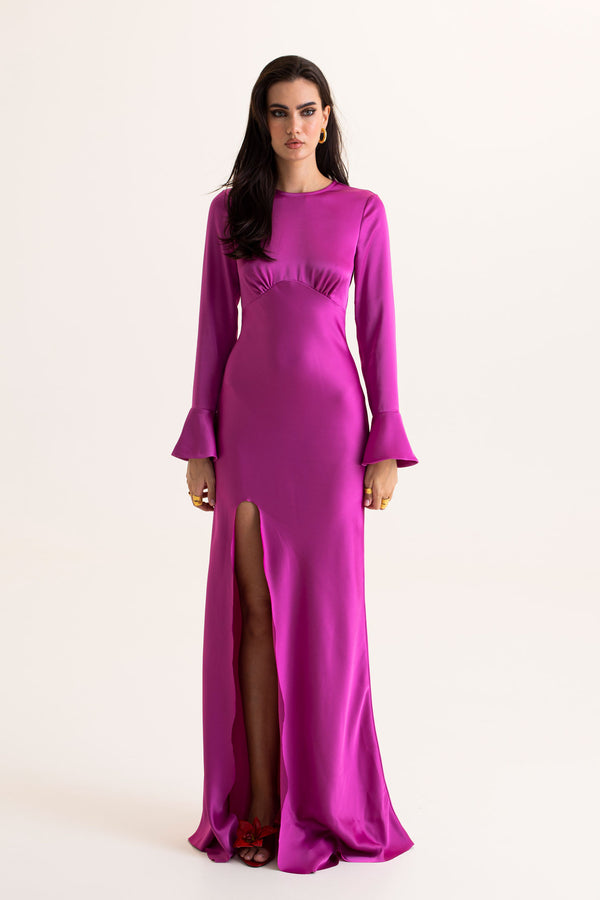 A flame disguised as silk — Rosa Dream is a floor-length gown that commands without a word. Cut from lustrous satin, it sculpts the figure with quiet intensity, its long sleeves finishing in subtle flared cuffs, like a whisper of drama. The high neckline speaks of composure, while the front slit interrupts with intention — a deliberate invitation to movement, to intrigue, to fire. From every angle, it burns with modern allure.