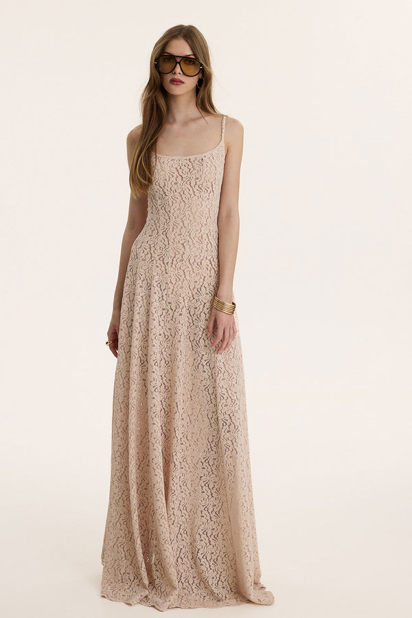 Second Skin is crafted from delicate nude lace that melts into the body, creating a seamless, sculpted silhouette. The thin straps and soft square neckline keep it clean and understated, while the fitted bodice flows into a long, fluid skirt that moves with effortless grace.The lace reveals subtle glimpses of skin, blending softness with quiet confidence. It doesn’t shout. It lingers.