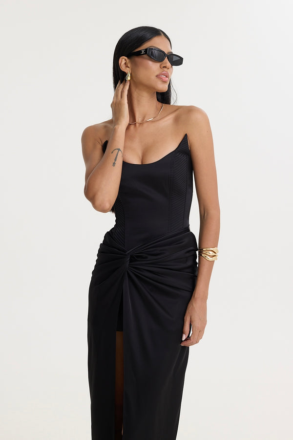 A study in structure and seduction, Silent Black is a floor-length gown designed for impact. The sculpted bustier bodice shapes and supports with architectural precision, while the gathered knot detail at the waist creates fluid movement and a sultry slit that reveals just enough. Clean lines contrast with soft draping, evoking a modern mystique.