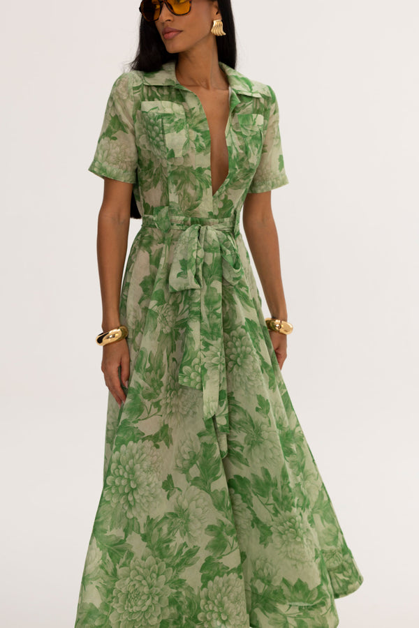 Let nature do the talking in The Botanica Dress, a breezy, full-length piece crafted from airy linen with an all-over soft green floral print. Featuring a structured collar, chest pockets, and a flattering tie waist, it blends tailored elegance with garden-party charm. The short sleeves and flowing skirt make it a dream for warm days, while the plunging neckline adds a modern, feminine twist.
