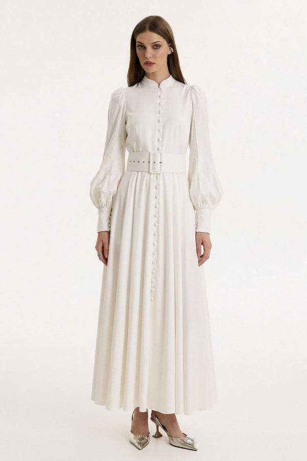 Crafted from breathable linen, this dress features a fitted bust and a relaxed, comfortable skirt. The waist belt is adjustable, allowing for a custom fit, while the back-zipper closure ensures a seamless finish.