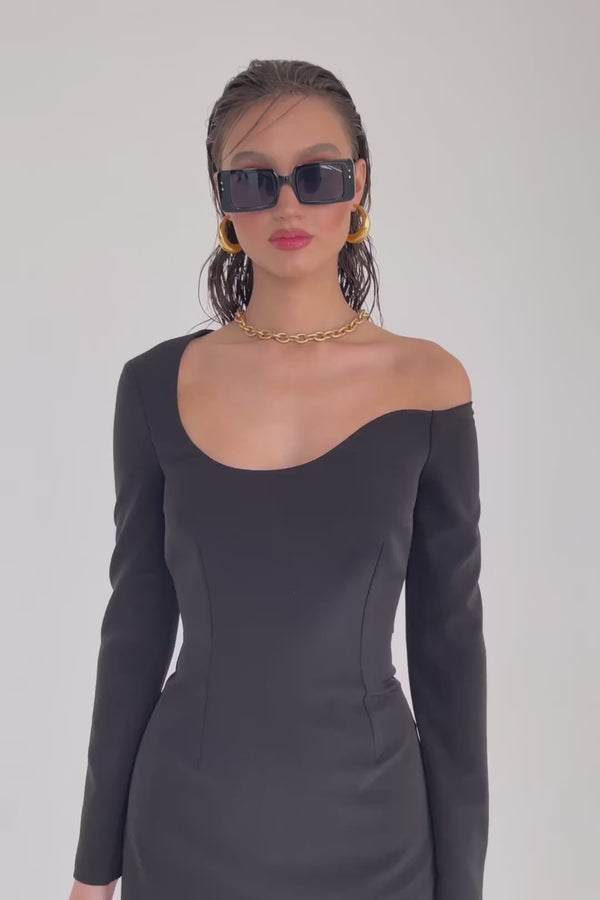 A silhouette cut on a whisper — Queen Bee is a mini dress that balances edge with elegance. Designed with a sculpted asymmetric neckline, it slips one shoulder bare while the other holds the line, creating a play of exposure and restraint. Long sleeves sharpen the silhouette, while the short hemline keeps it daring, sleek, and undeniably modern. It’s not just a little black dress — it’s the curve that lingers.