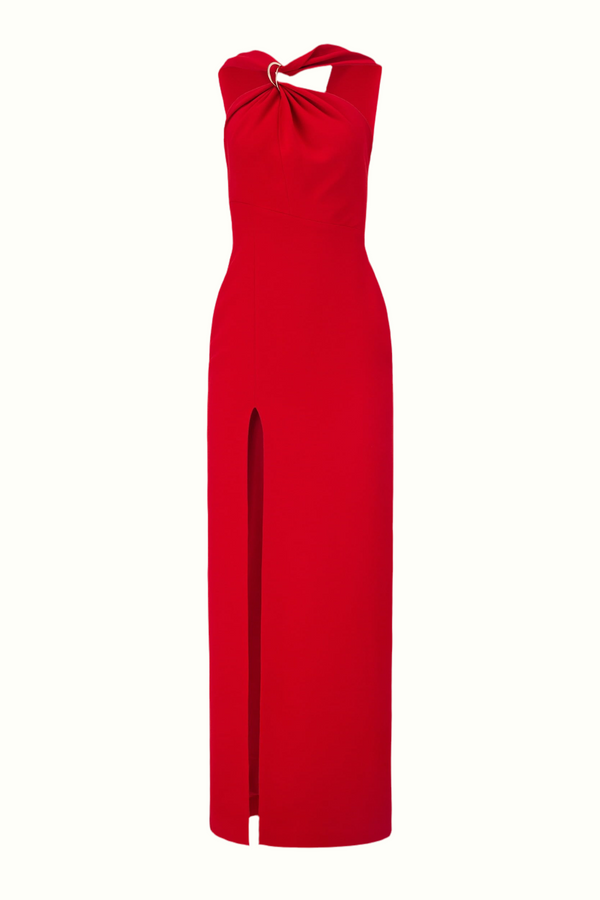 A flame sculpted into form — The Red Dress is a gown that carries both edge and elegance. Cut in a one-shoulder silhouette, it gathers at the collarbone with a subtle knot detail, letting the line fall clean and powerful. The fitted shape flows into a daring thigh-high slit, balancing restraint with undeniable fire. Striking in its simplicity, it is a dress that makes the night its own.