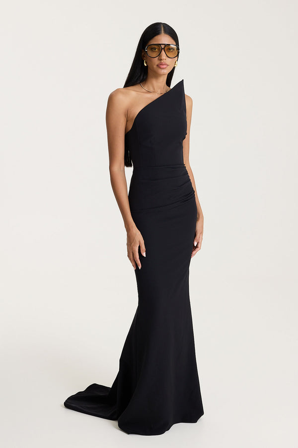 Step into sleek sophistication with the Triangle of Love — a masterclass in sharp tailoring and modern allure. Defined by its sculptural one-shoulder neckline and flawless draping, this silhouette carves out elegance with a quiet kind of power. The deep black hue exudes timeless drama, while the elongated form hugs and flows in all the right places.