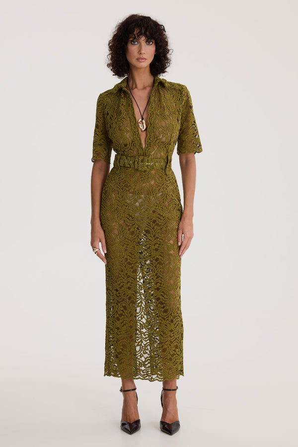 A study in earthy seduction, Tropical Sinner is crafted from intricate botanical lace in a deep, moss-green hue that feels wild yet undeniably refined. The plunging neckline and softly structured collar introduce a touch of daring, balanced by delicate half sleeves and a matching belt that sculpts the waist with effortless allure. The midi silhouette drapes clean and elongated, revealing whisper-thin glimpses of skin through the lace—sensual, confident, and deliciously untamed.