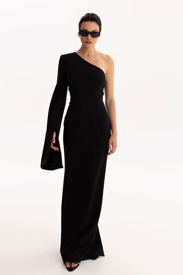 A study in sculpted minimalism — Wildcat Dress is a gown that commands through purity of line and quiet force. The asymmetric neckline reveals one shoulder in precise balance, while the opposite side falls into a single long sleeve, extending its elegance in contrast. Cut close to the body and flowing to the floor, the silhouette is both architectural and fluid, a vision of power refined into simplicity.