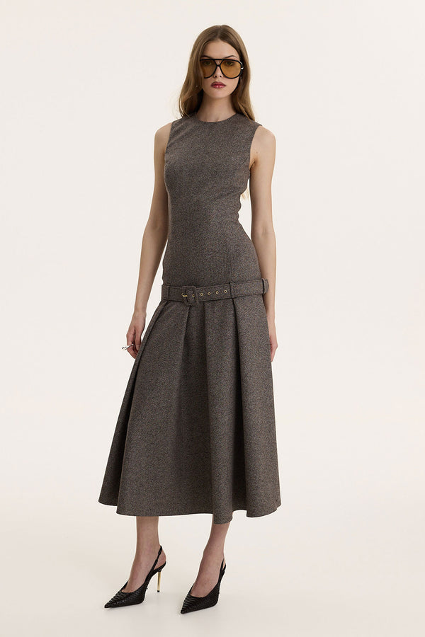 Wool Legacy is crafted from structured wool fabric in a rich, earthy brown tone that feels timeless and intelligent. The clean sleeveless bodice sculpts the upper body before falling into a defined drop waist, finished with a matching belt for subtle emphasis.